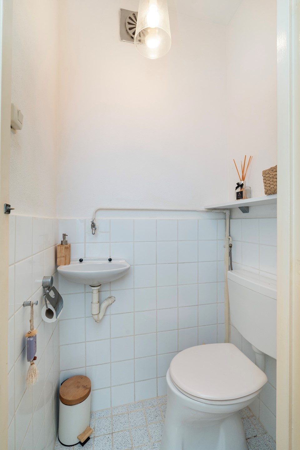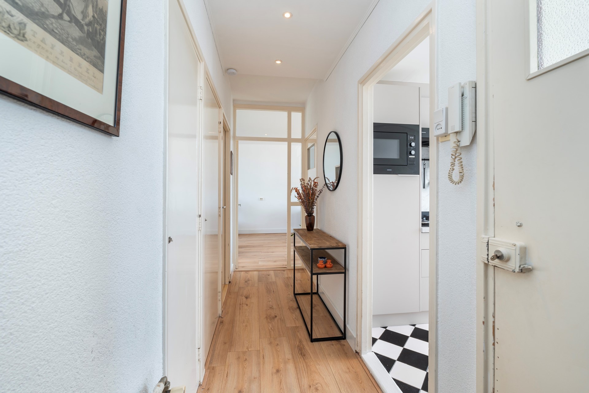 Hal met intercominstallatie, meterkast, CV-kast, het toilet en toegang tot de keuken en woonkamer