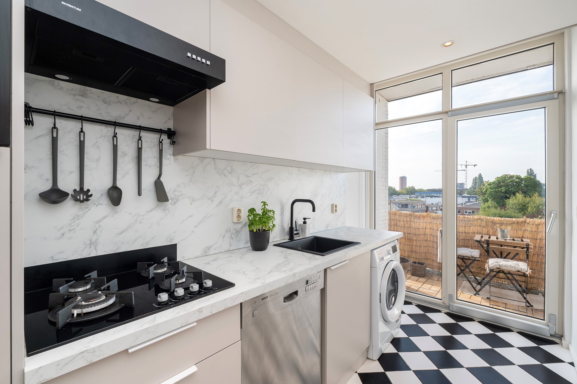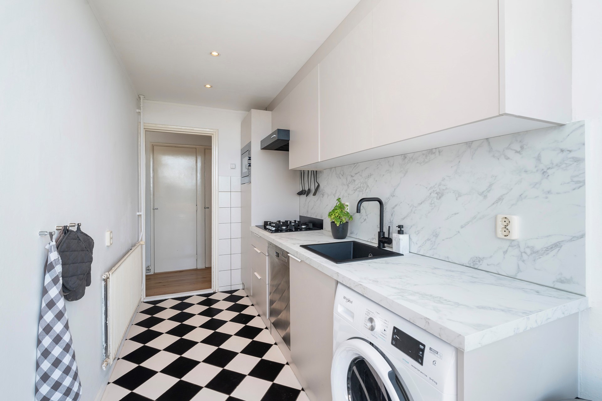 Through the central hall where you entered earlier, you can access the recently renovated kitchen (2025). The kitchen looks quite stylish and is equipped with a 4-burner gas stove, re-circulation hood, a combi-oven/microwave, a dishwasher and a washing-machine connection.