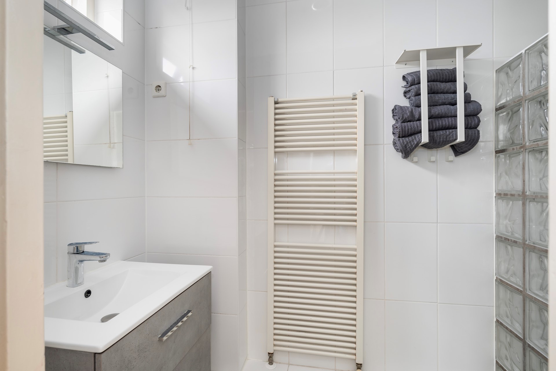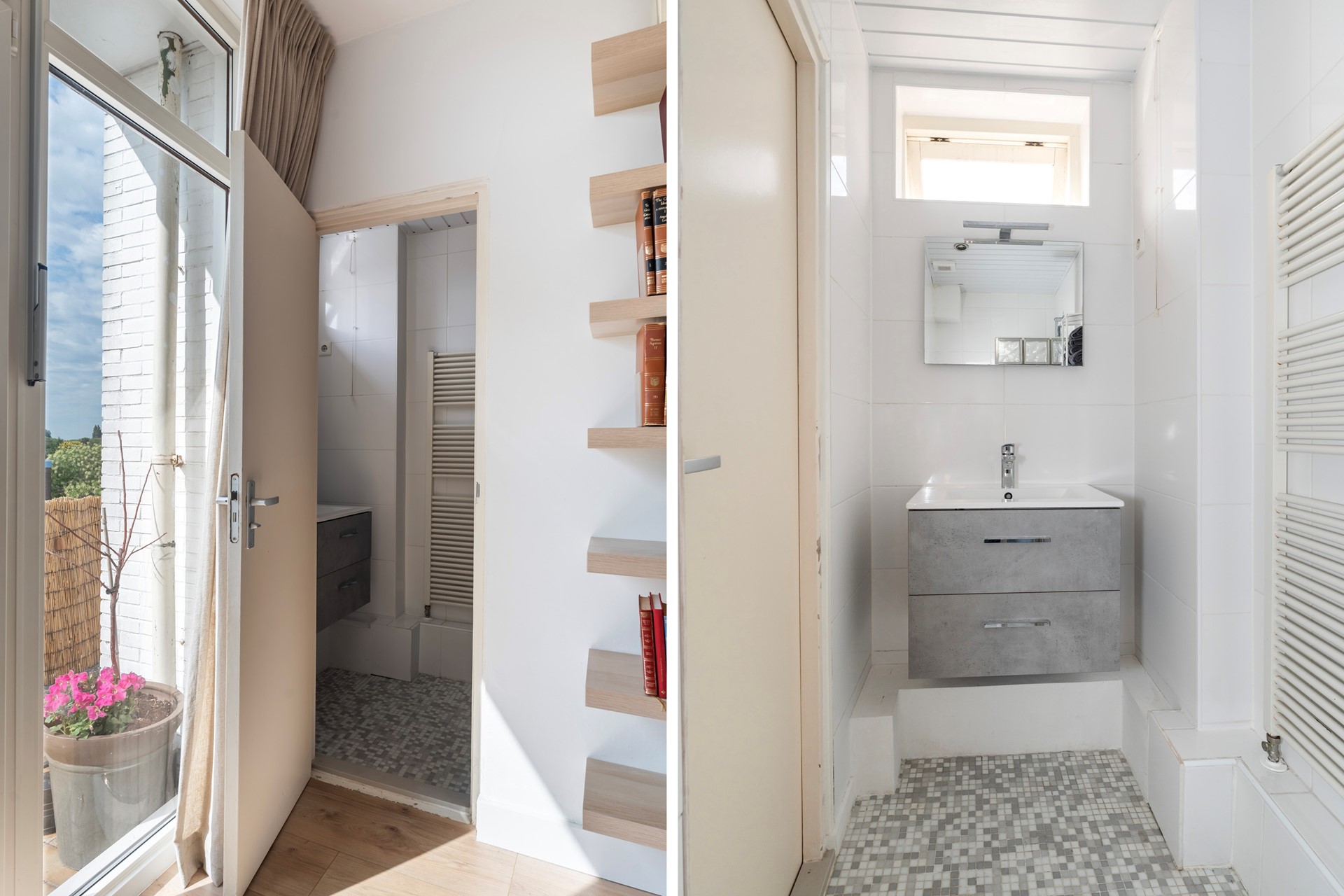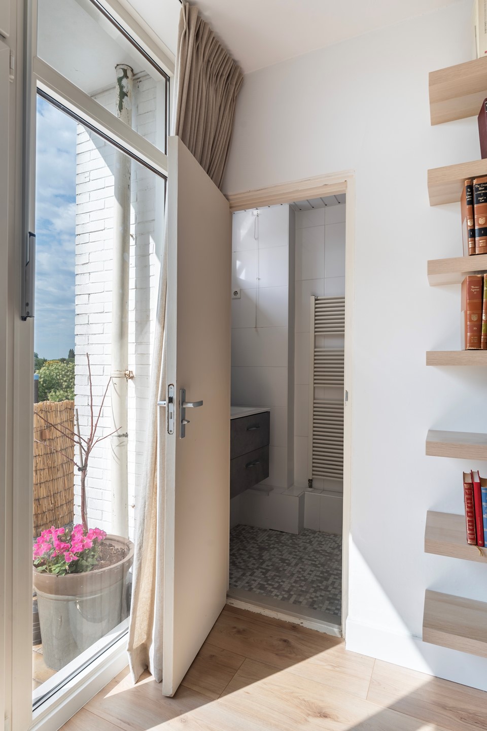 Vanuit de woonkamer is daarnaast de nette badkamer bereikbaar, voorzien van en inloopdouche met thermostaatkraan, wastafel met meubel en een handdoekradiator.