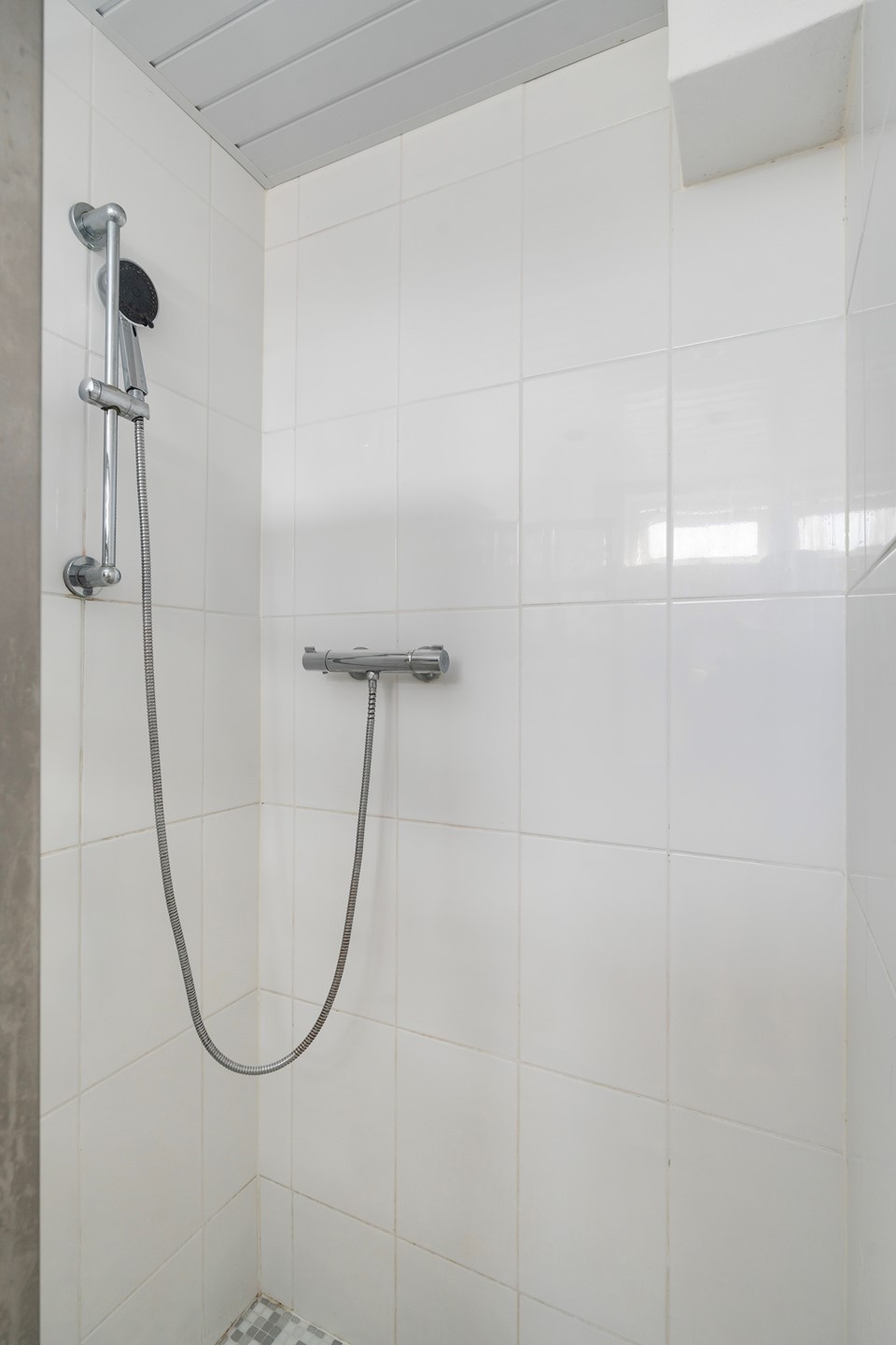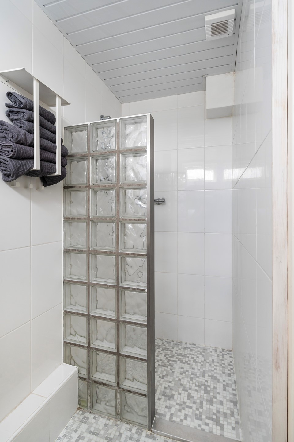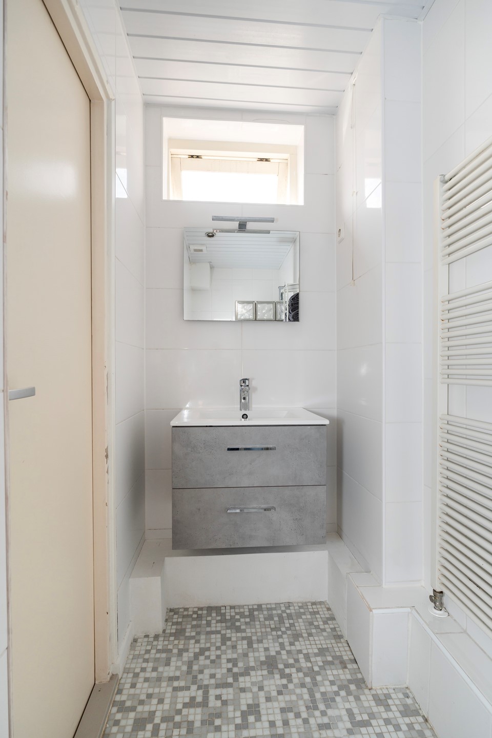 Vanuit de woonkamer is daarnaast de nette badkamer bereikbaar, voorzien van en inloopdouche met thermostaatkraan, wastafel met meubel en een handdoekradiator.