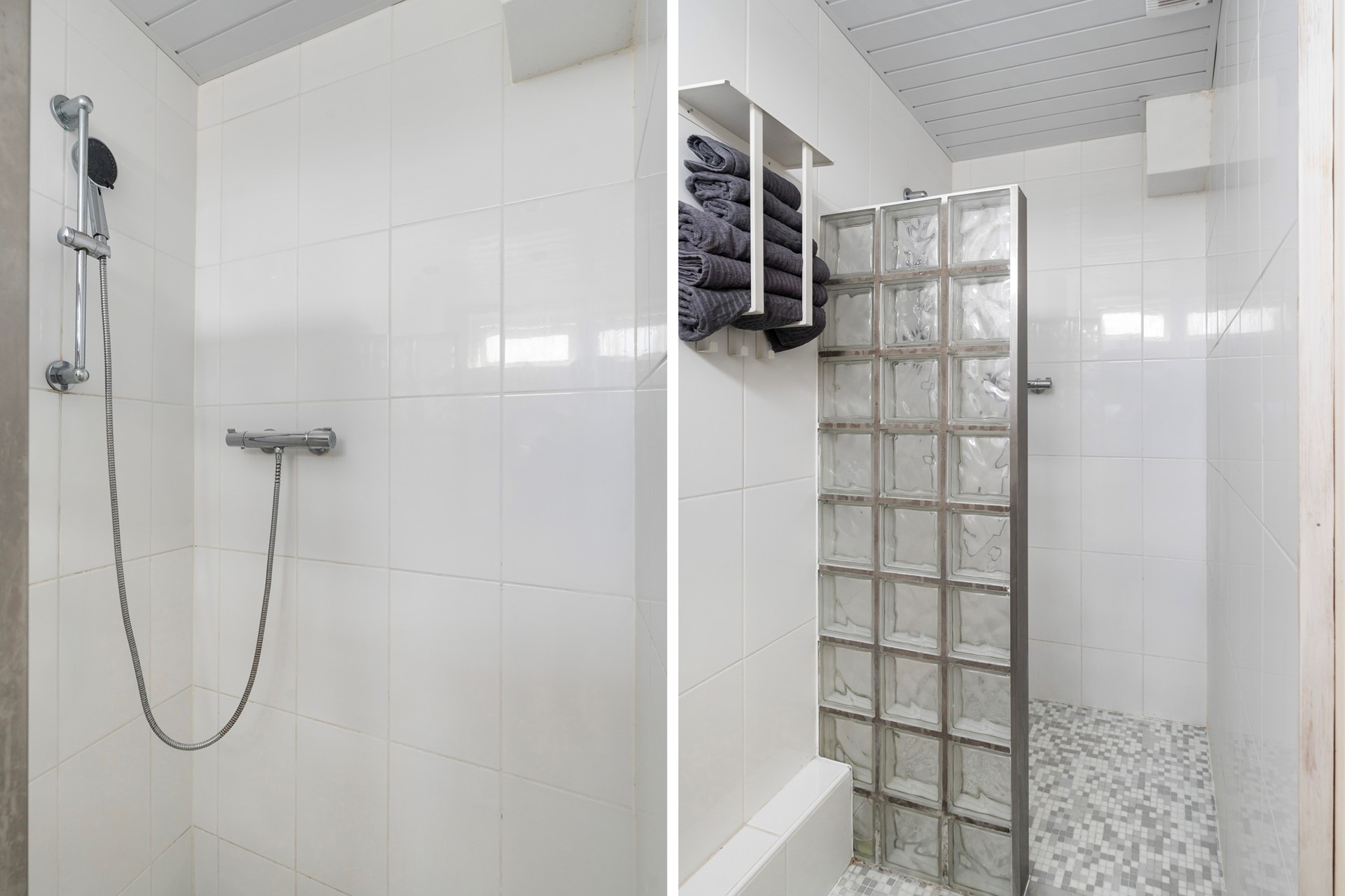 The neat bathroom is also accessible from the living room and is equipped with a walk-in shower with thermostat tap, washbasin with cabinet and a towel radiator.