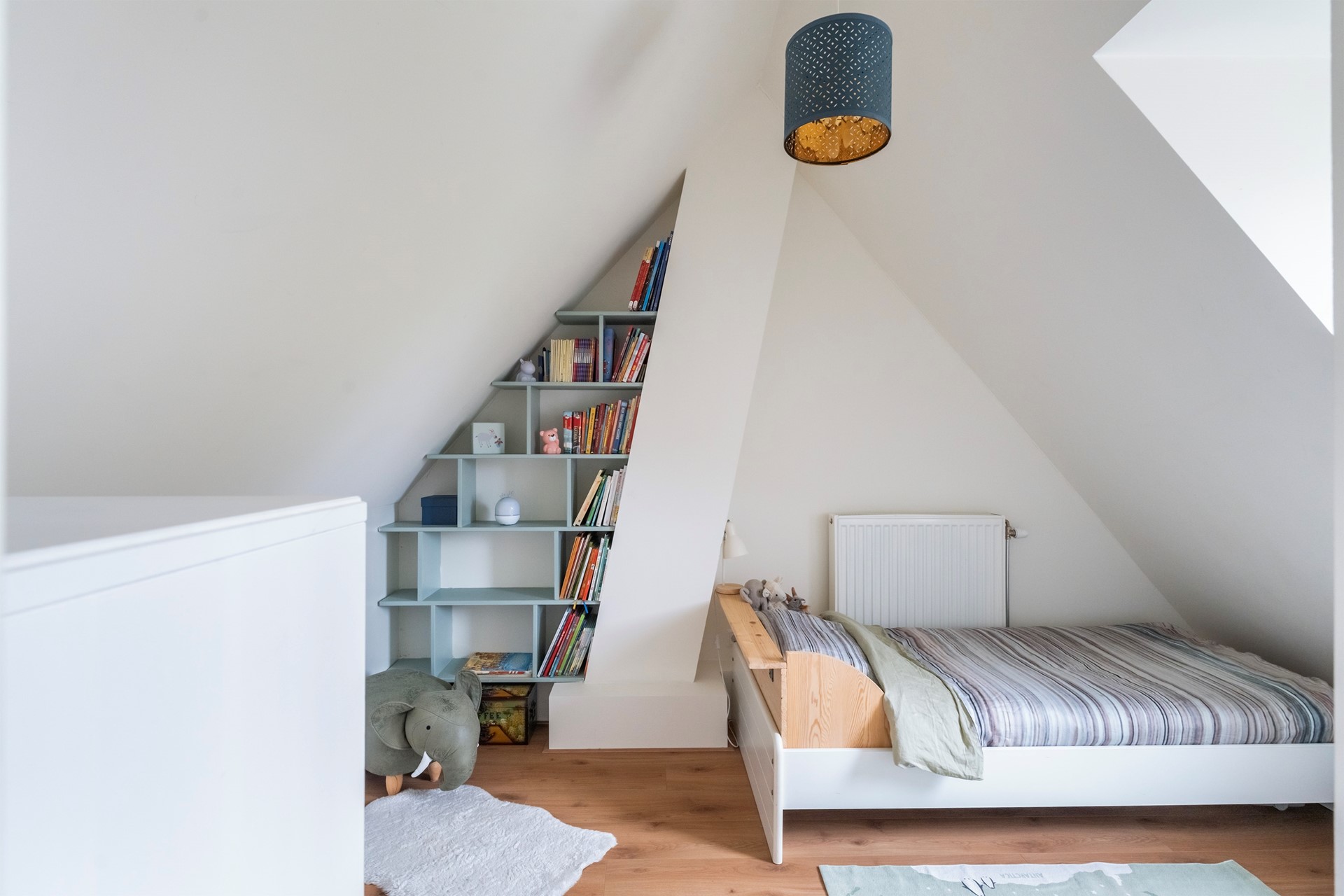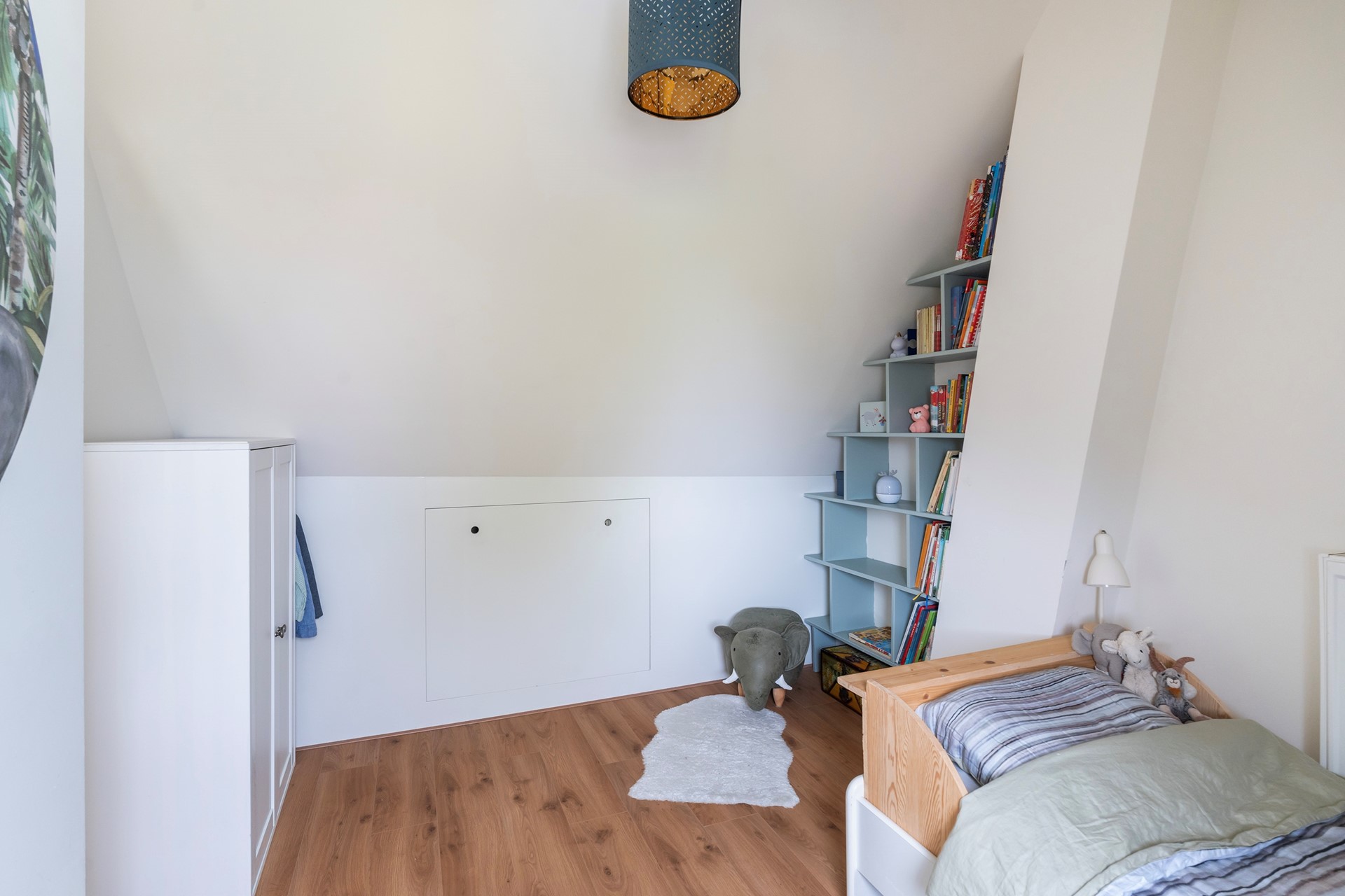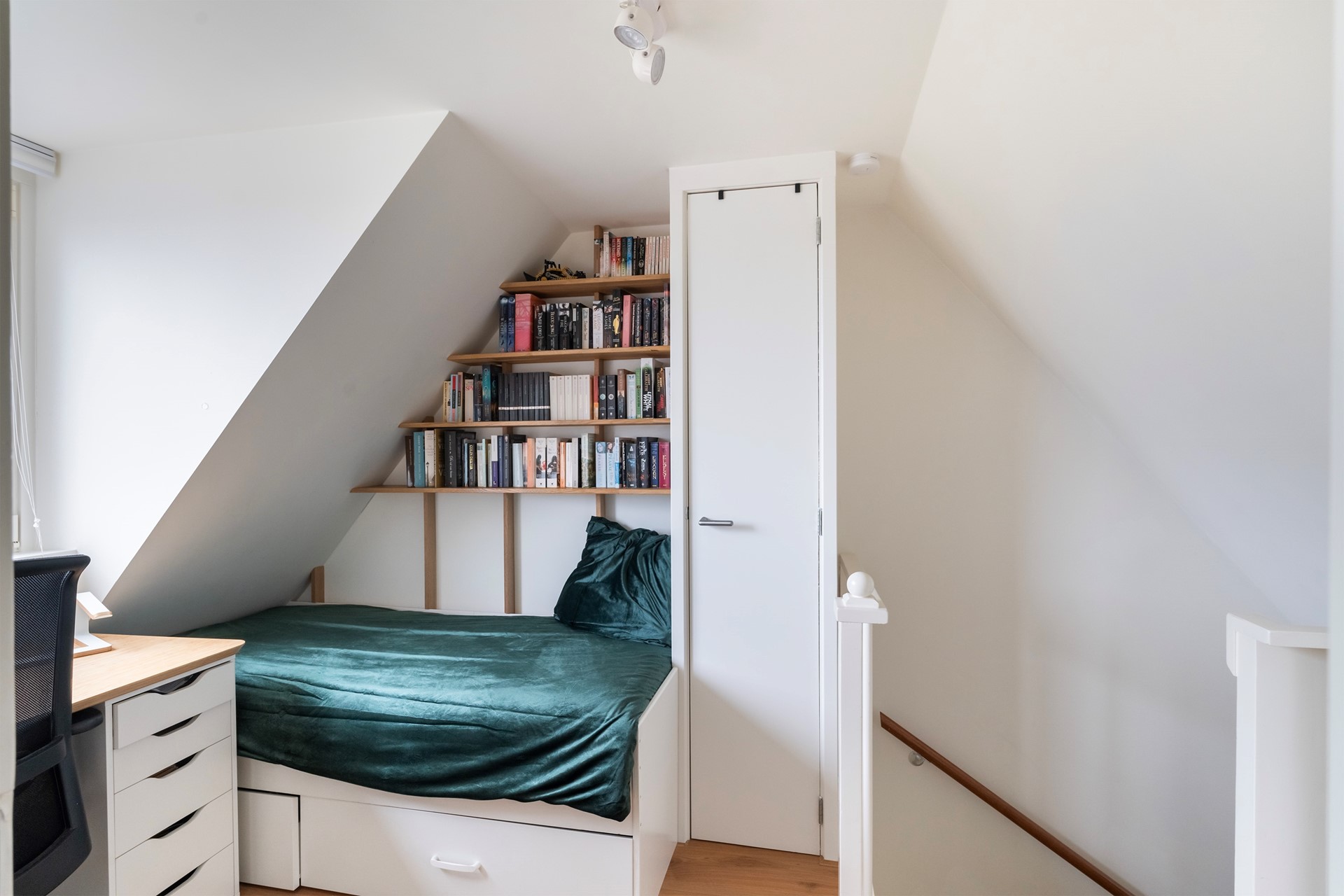 De tweede verdieping is verrassend ruim en ingericht met een derde slaapkamer, werkruimte, logeerbed en bergruimte achter de knieschotten. Een compacte bergzolder maakt het geheel compleet.