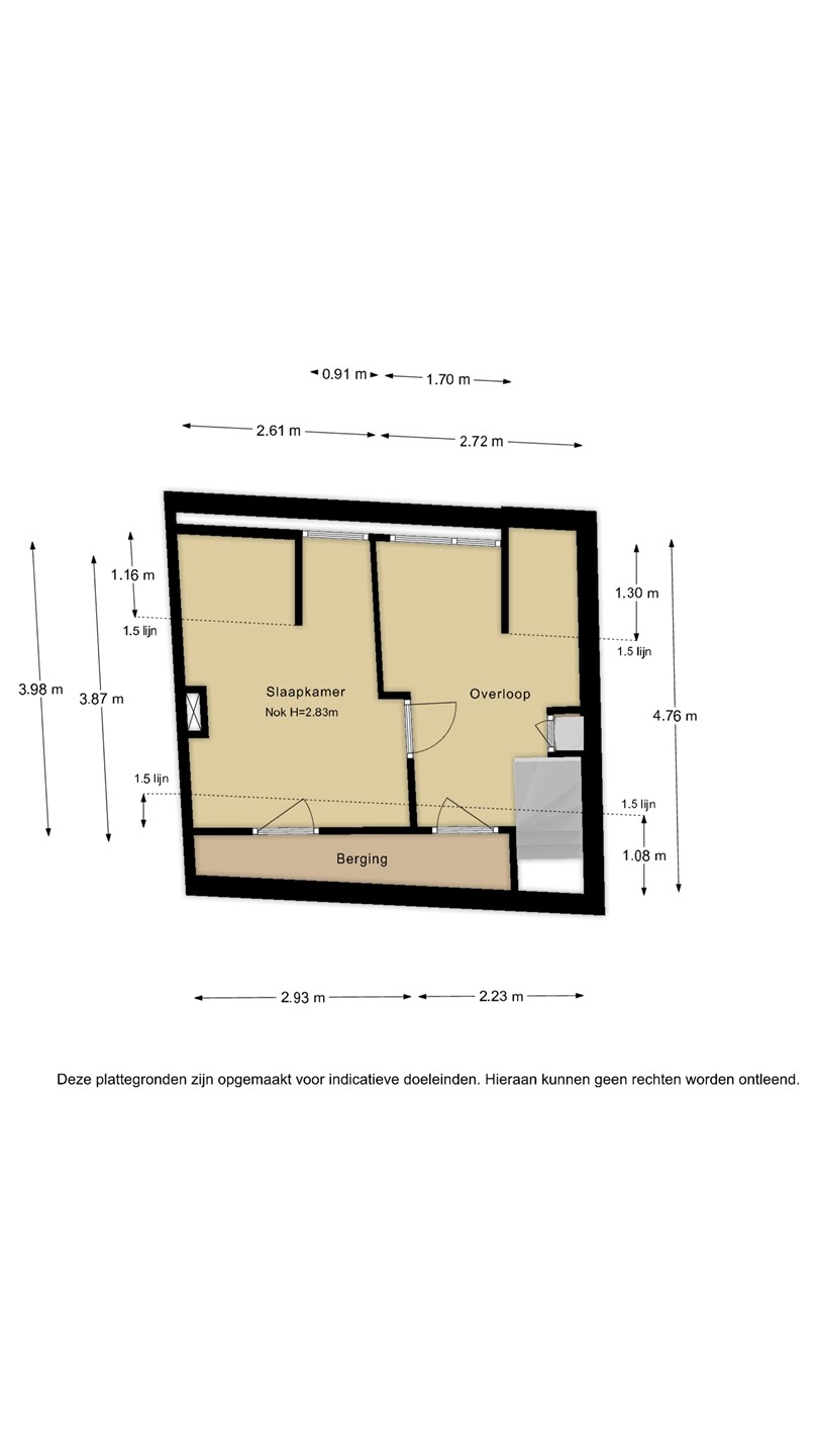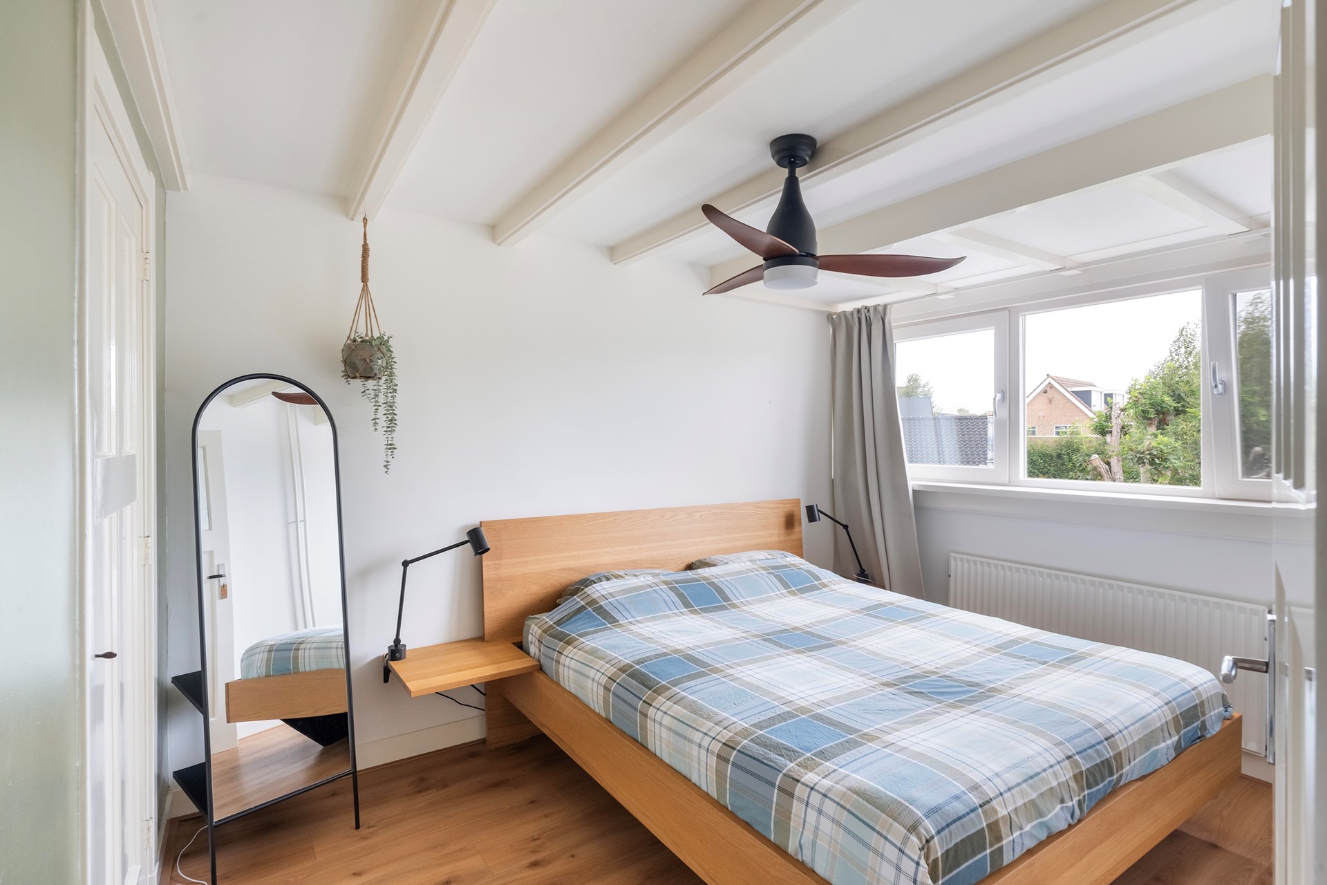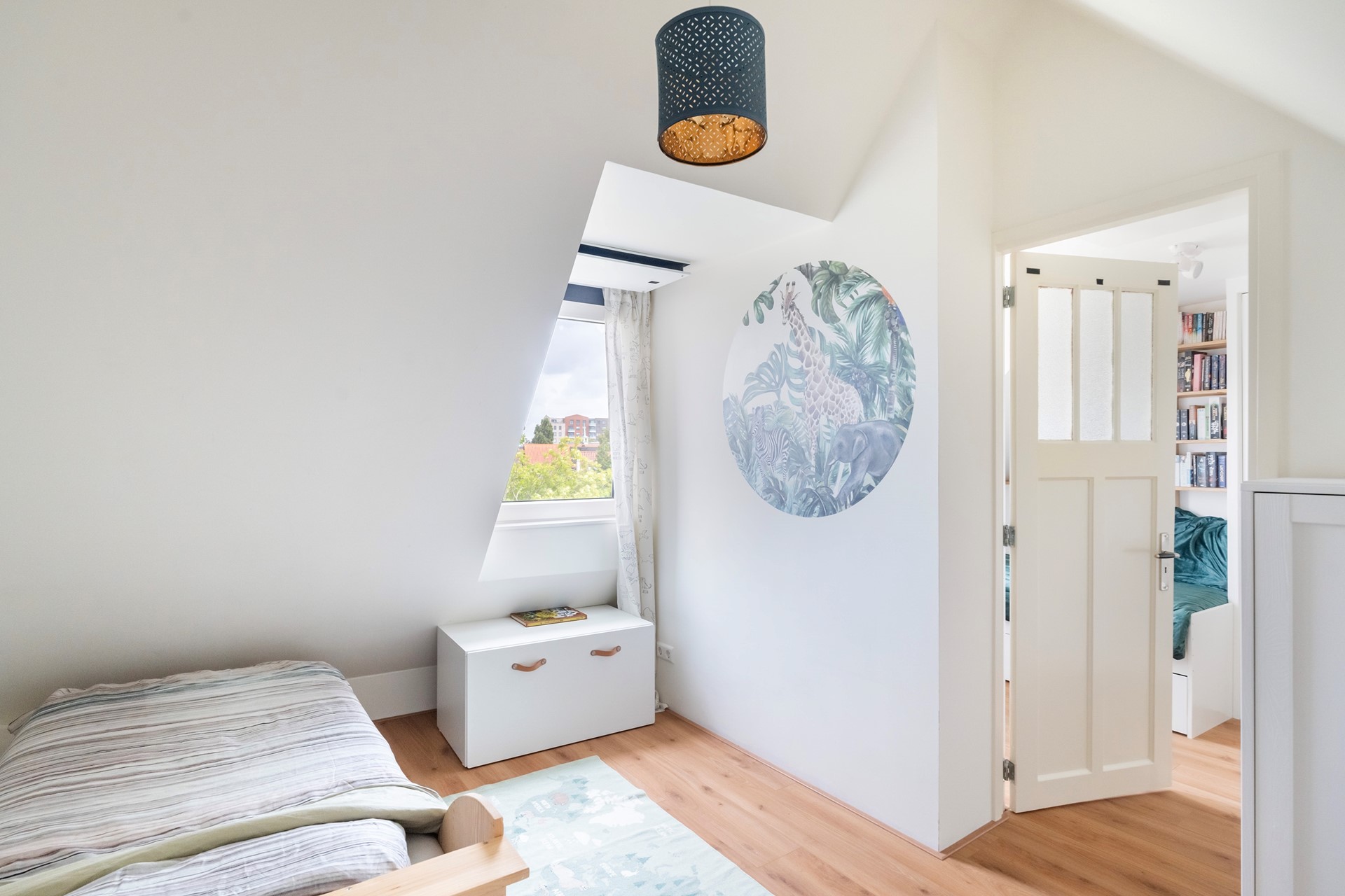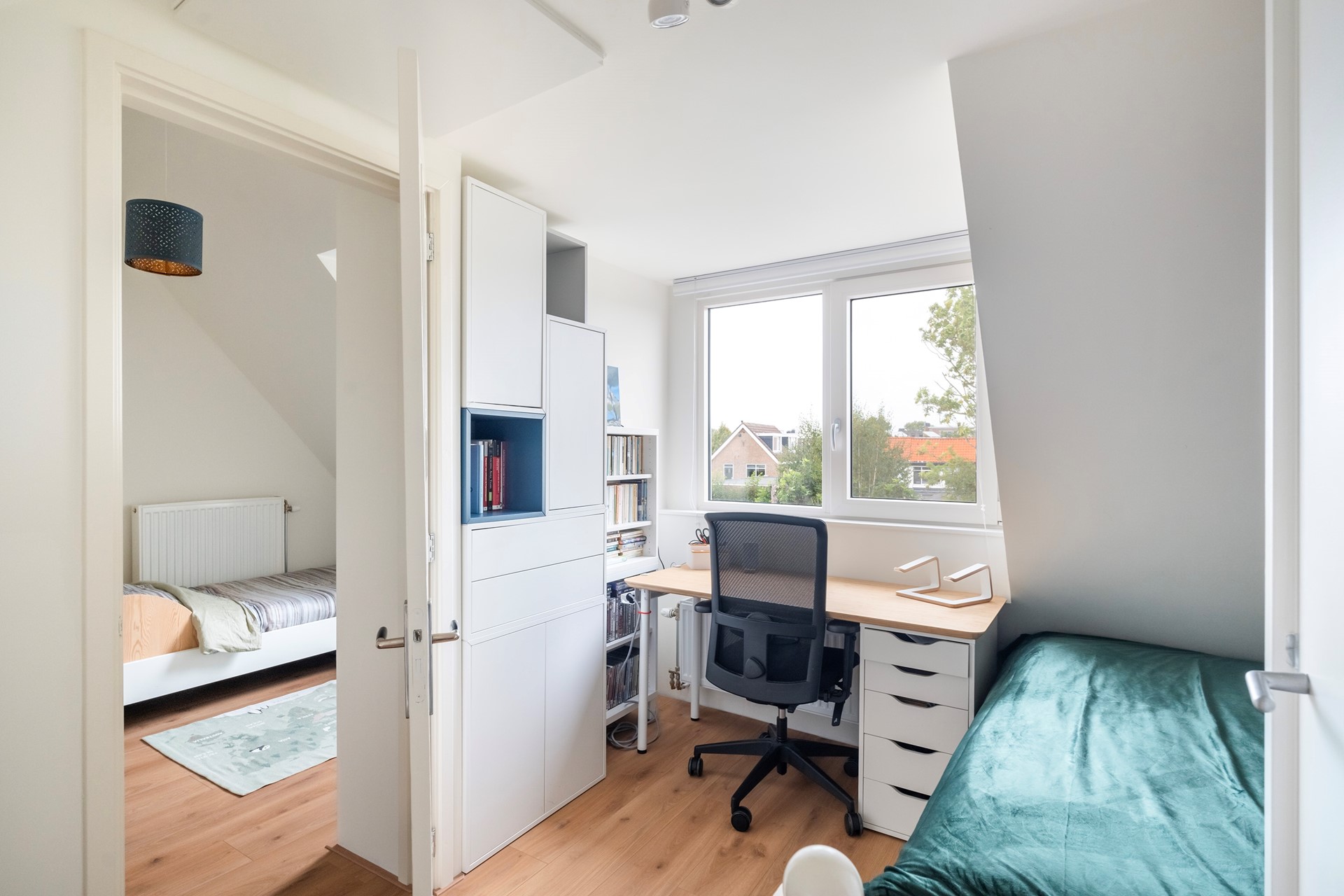 De tweede verdieping is verrassend ruim en ingericht met een derde slaapkamer, werkruimte, logeerbed en bergruimte achter de knieschotten. Een compacte bergzolder maakt het geheel compleet.