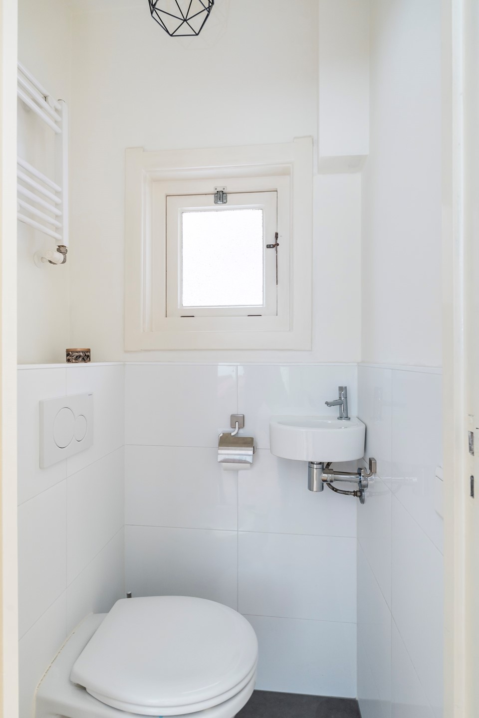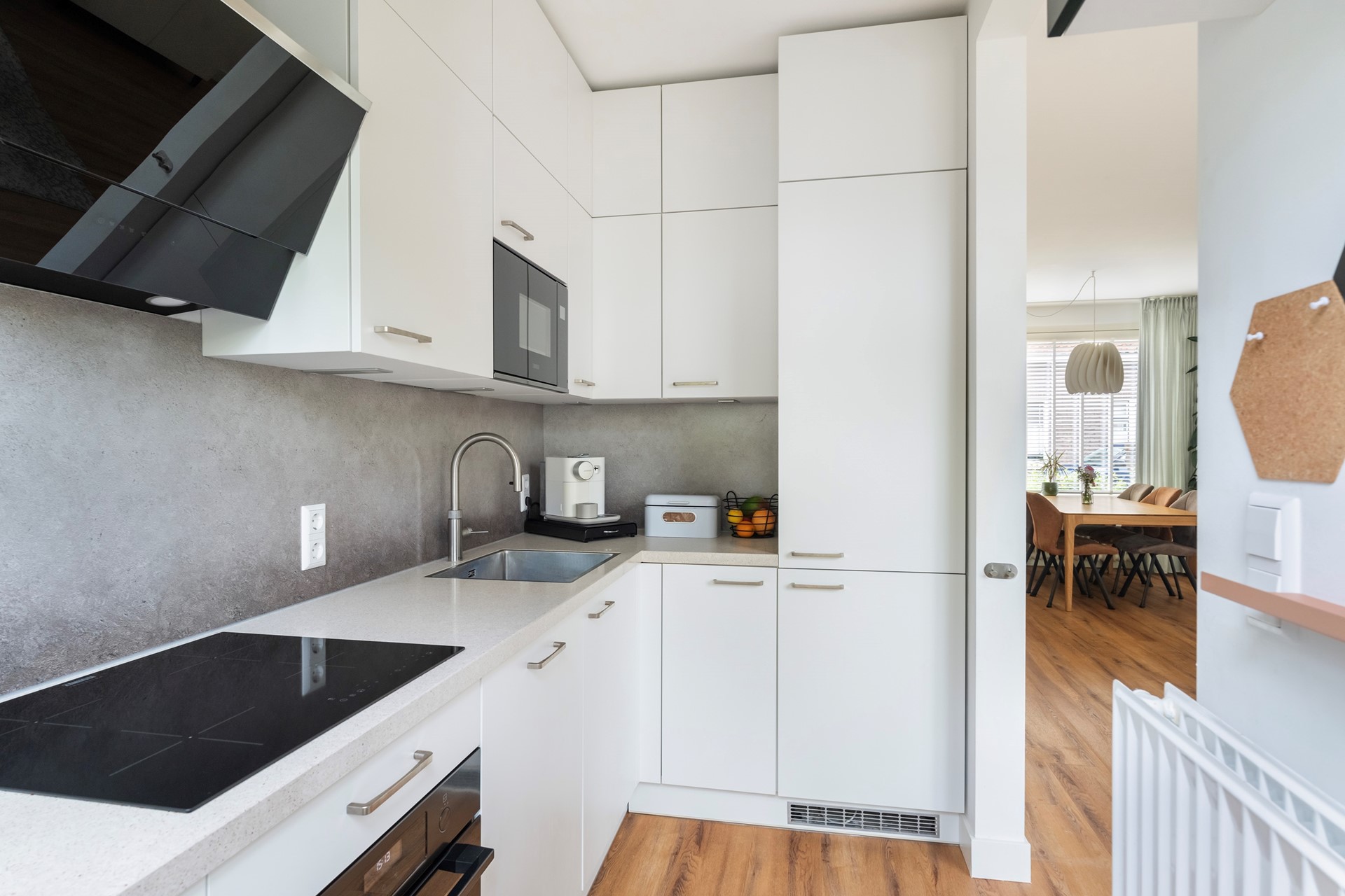 The modern open-plan kitchen is fully equipped with an induction cooktop, oven, microwave, fridge-freezer, dishwasher, and a Quooker. In the hall, you'll find the toilet with a small sink and a practical under-stairs cupboard.