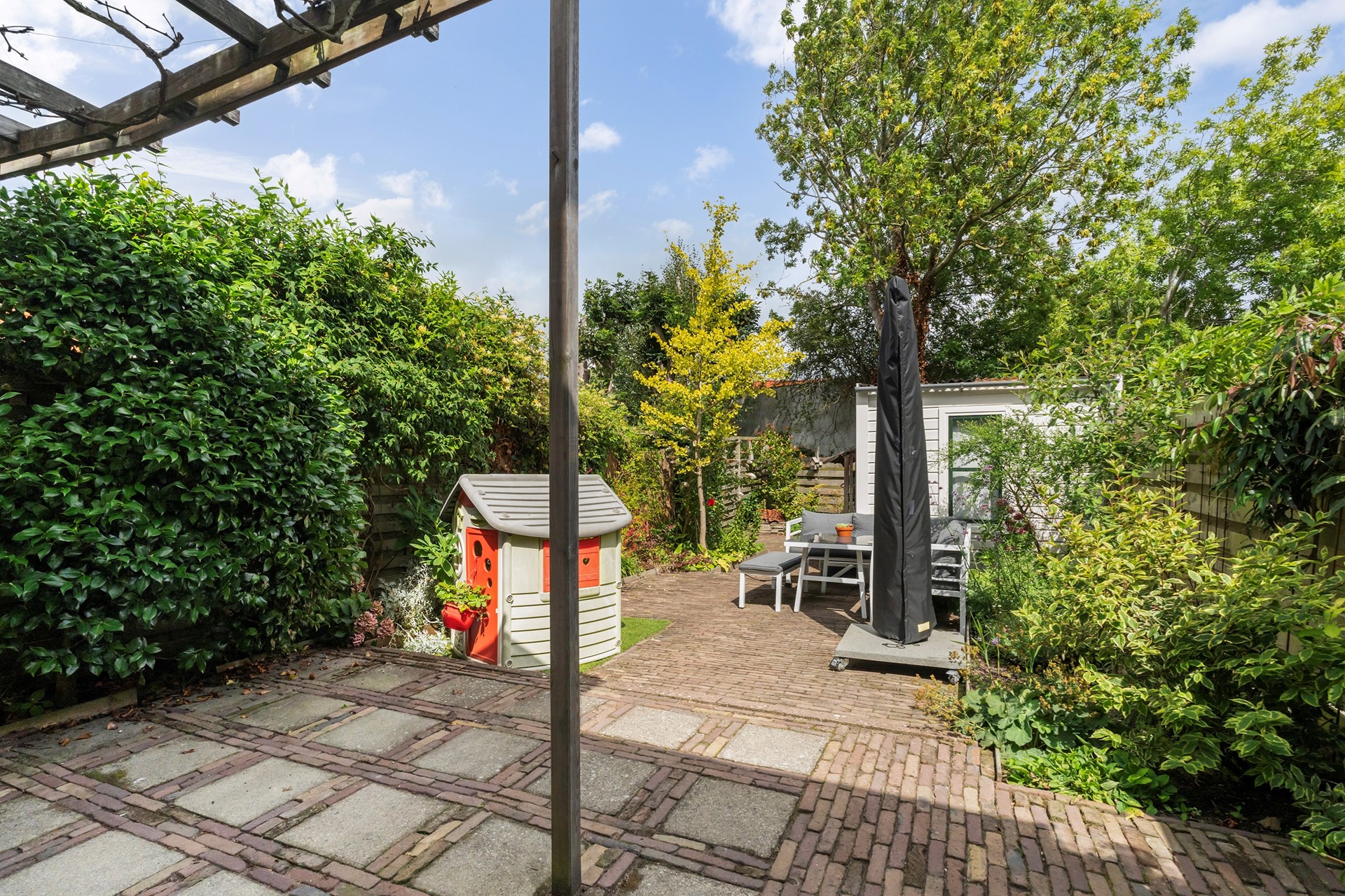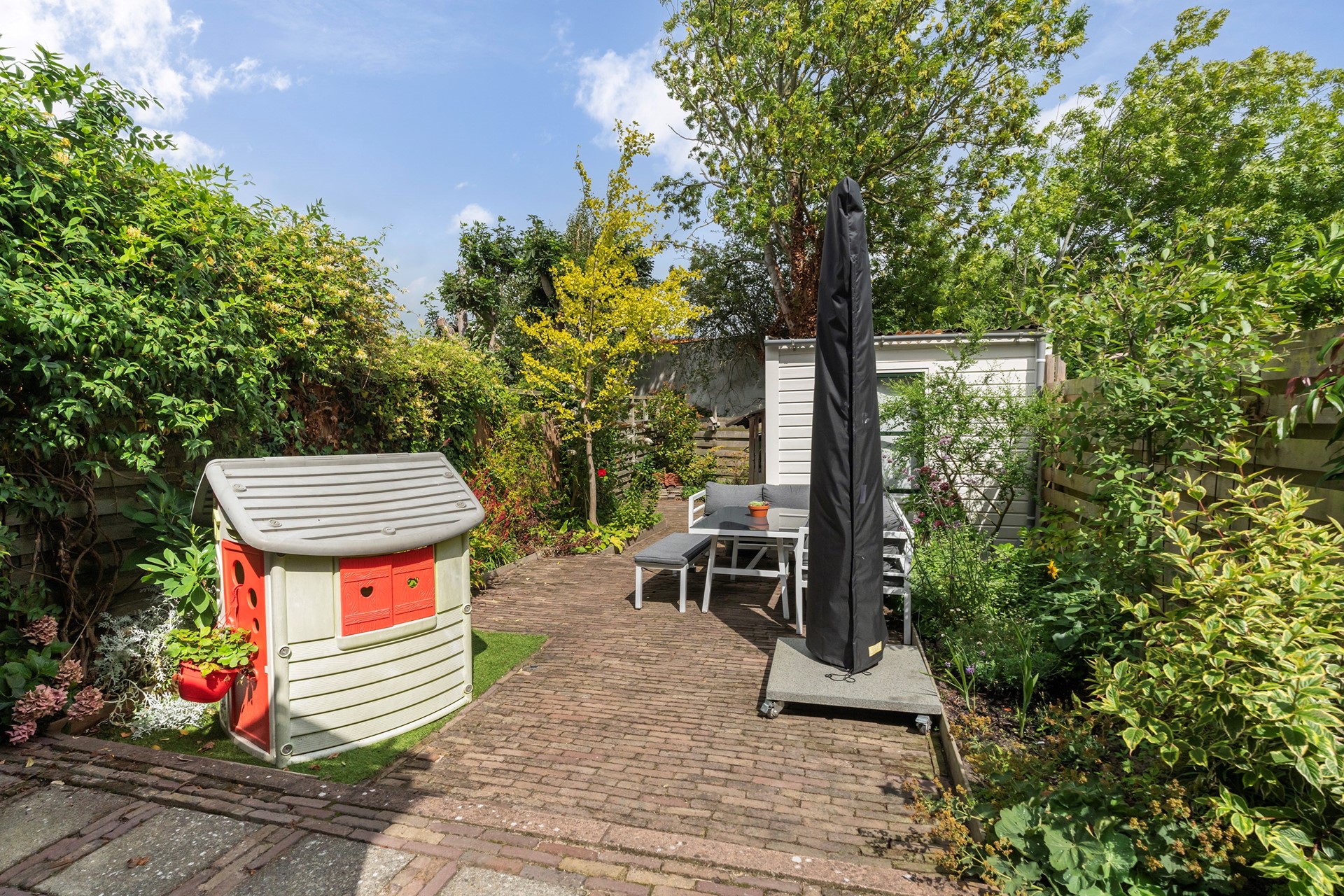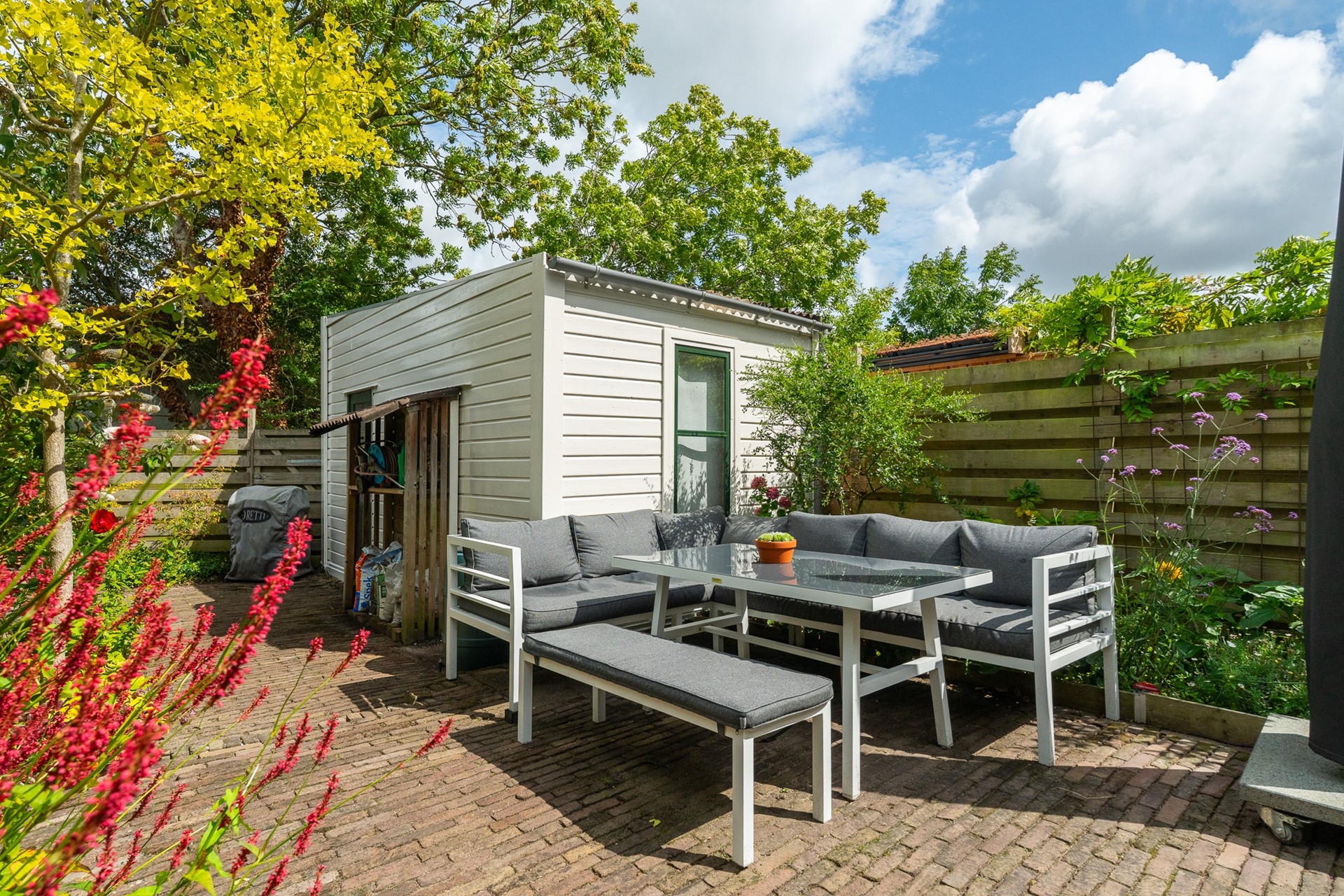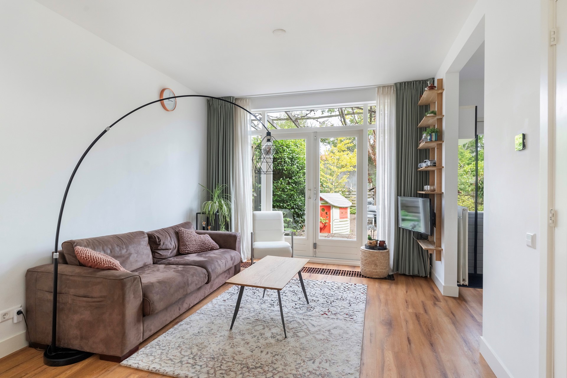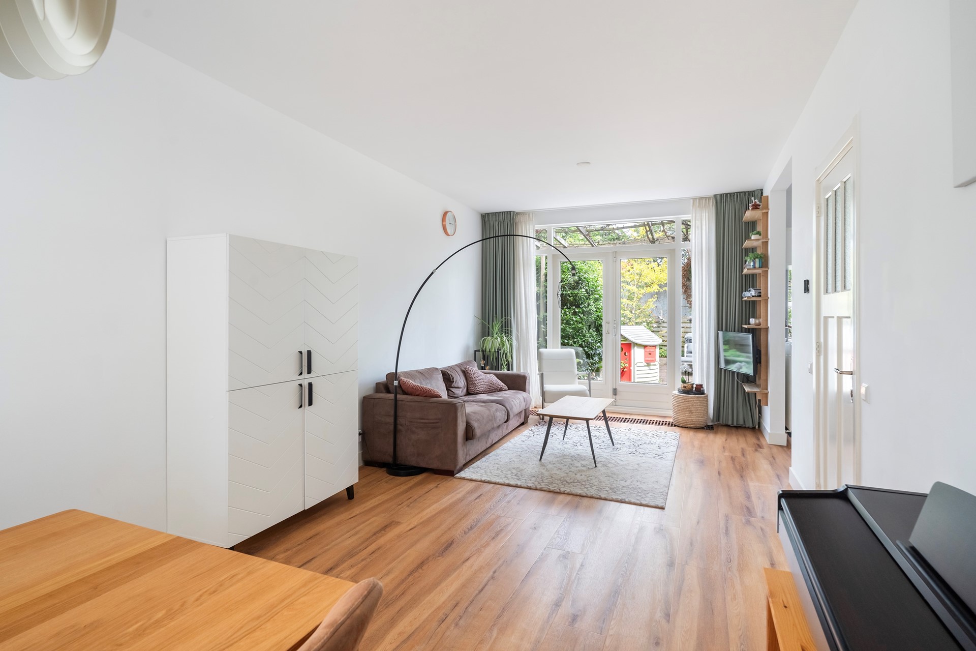 De lichte woonkamer is een heerlijke plek om te ontspannen. Via de dubbele openslaande deuren stapt u zo de diepe en zonnige tuin in, die ook via de keuken bereikbaar is. De tuin beschikt over een ruime berging en een handige achterom via de steeg.