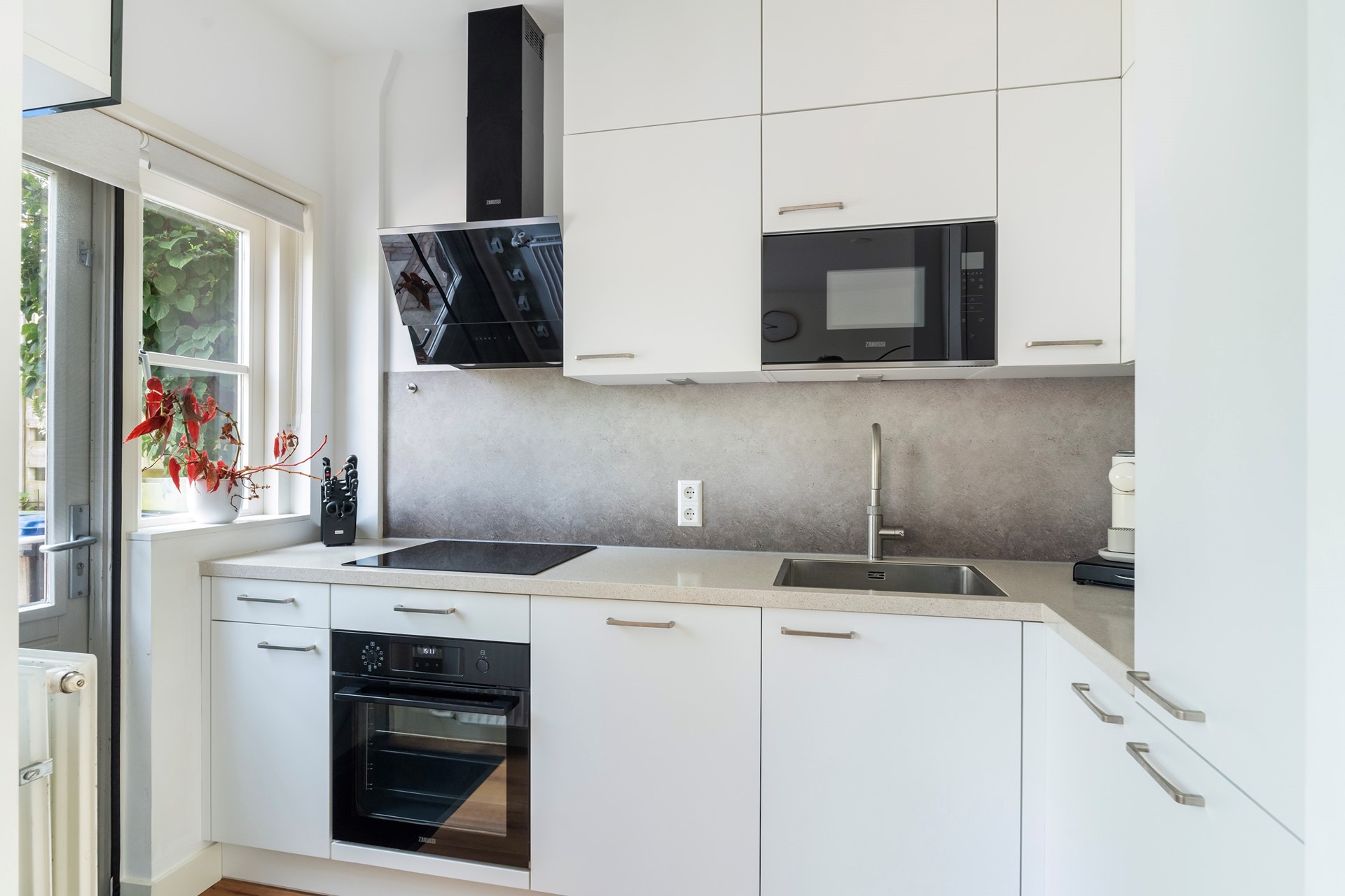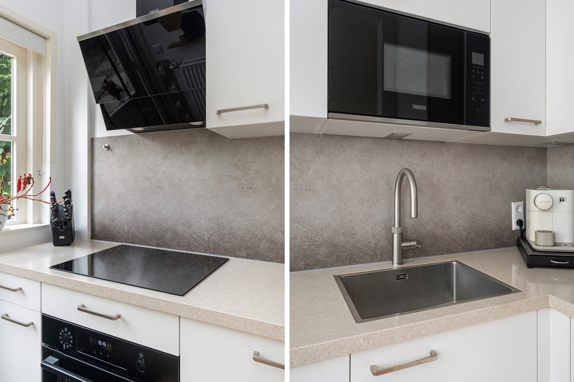 De moderne open keuken is volledig ingericht met o.a. een inductiekookplaat, oven, magnetron, koel-vriescombinatie, vaatwasser en een Quooker. In de hal vindt u het toilet met fonteintje en een praktische trapkast.